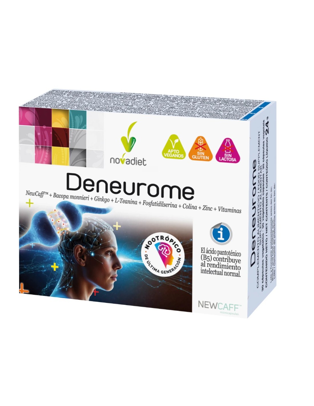 Deneurome de Nova Diet es un complemento alimenticio a base de NewCaff™, Bacopa monnieri, Ginkgo, L-Teanina, Fosfatidilserina, Colina, Zinc y Vitaminas. Ayuda a mejorar las funciones cognitivas: estimula la memoria, mejora la atención y la concentración, mejora el aprendizaje y a disminuir el cansancio y a aumentar la energía en períodos de carga mental.